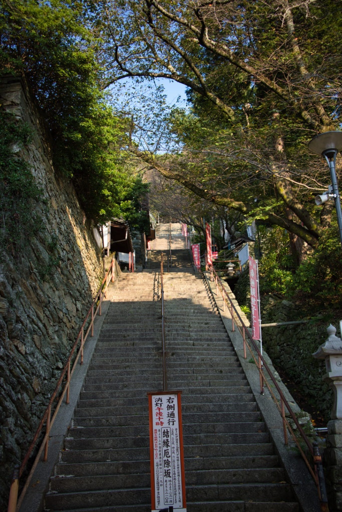 楼門をくぐると、「速駈詣り」で知られている、210段もの石段があります。私は徒歩で登ったのですが、心配な人にはケーブルカー「文左衛門」もあります。